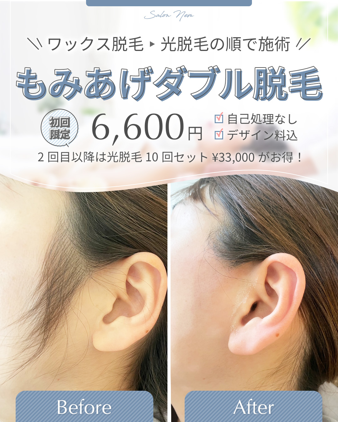 サロンネムのもみあげ脱毛はワックス&光で脱毛します。剃らないからチクチク・ジョリジョリなし!産毛〜しっかり生えている髪の毛も脱毛OK