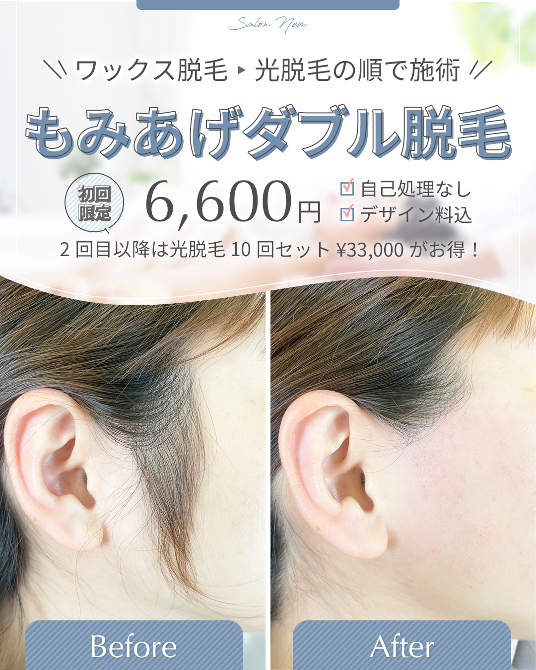 サロンネムのもみあげ脱毛はワックス&光で脱毛します。剃らないからチクチク・ジョリジョリなし!産毛〜しっかり生えている髪の毛も脱毛OK
