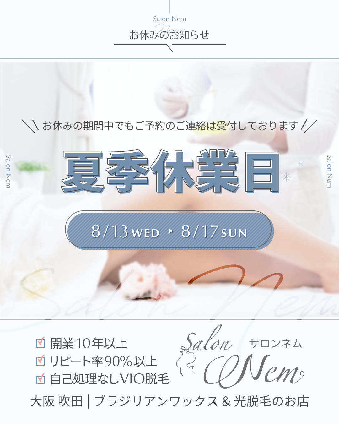北摂 ブラジリアンワックスと光脱毛|サロンネム吹田